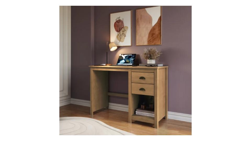 possui puxadores metálicos, no estilo concha e na cor ouro envelhecido