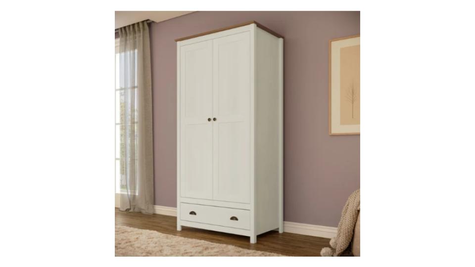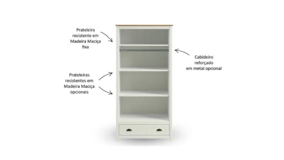 o móvel acompanha 3 prateleiras, em madeira maciça, e um cabideiro de alumínio.