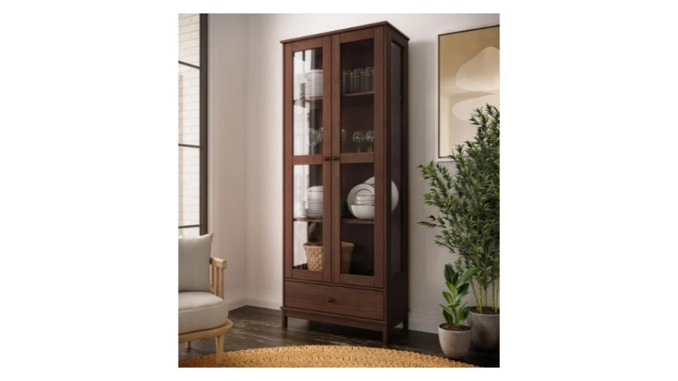 • As portas da Cristaleira possuem puxadores metálicos em ouro envelhecido e os pés retos em madeira maciça complementam o visual clássico e elegante da peça.