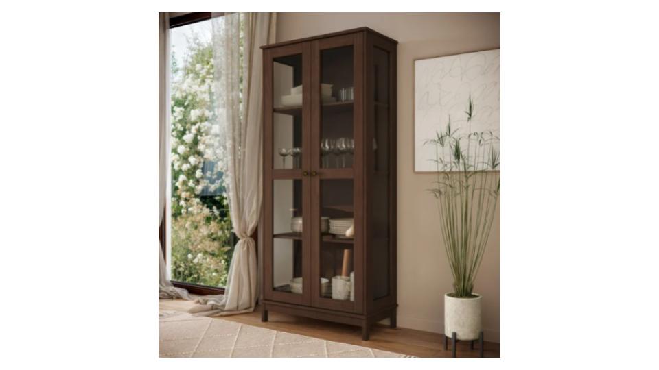 • As portas da Cristaleira possuem puxadores metálicos em ouro envelhecido e os pés retos em madeira maciça complementam o visual clássico e elegante da peça.