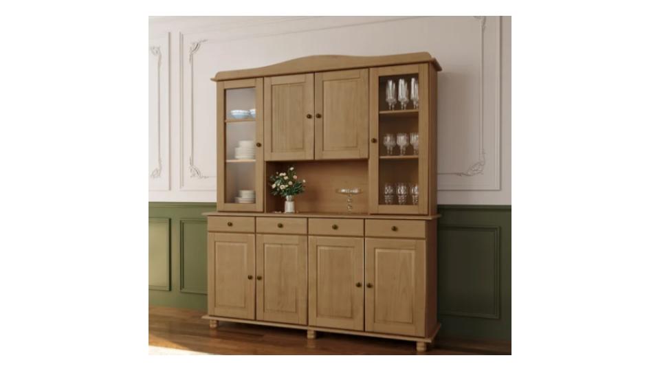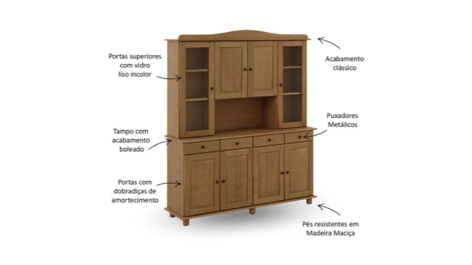 - A portas e gavetas da cristaleira possuem puxadores metálicos, no estilo botão e na cor ouro envelhecido,
